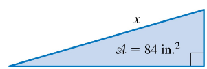 The following exercises are geometric in nature and lead to polynomial models. Solve each problem. A certain right triangle has area 84 in.2. One leg of the triangle measures 1 in. less than the hypotenuse. Let x represent the length of the hypotenuse. Express the length of the leg mentioned above in terms of x. Give the domain of x.