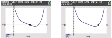 Solve each problem. A comprehensive graph of ƒ(x)=x4-7x3+18x2-22x+12 is shown in the two screens, along with displays of the two real zeros. Find the two remaining nonreal complex zeros.