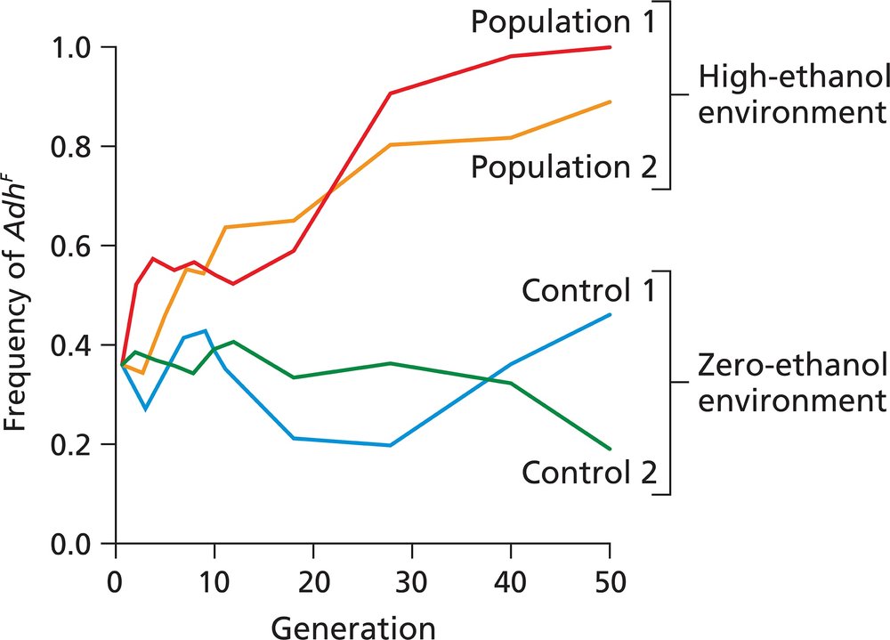 The figure illustrates the effect of an ethanol-rich and an ethanol-free environment on the frequency of the Drosophila AdhF allele in four populations in a 50-generation laboratory experiment. Population 1 and population 2 were reared for 50 generations in a high-ethanol environment, while control 1 and control 2 populations were reared for 50 generations in a zero-ethanol environment. Describe the effect of each environment on the populations, and state any conclusions you can reach about the role of any of the evolutionary processes in producing these effects.