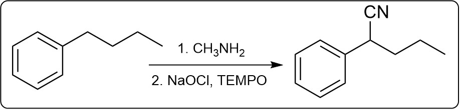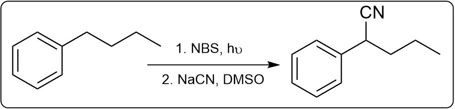 Provide a reaction scheme showing the conversion of butylbenzene to 2-phenylpentanenitrile. Explain the possible unwanted reactions that could result in undesirable impurities in the product. Ignore stereochemistry.