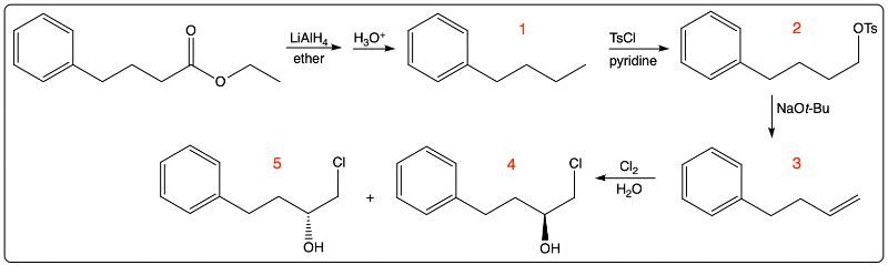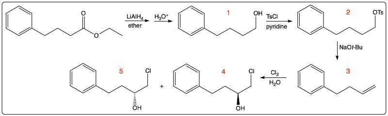 Draw the structures of (1) through (5) in the following scheme: