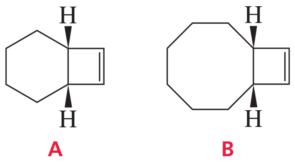 Explain why compound A will not undergo a ring-opening reaction under thermal conditions, but compound B will.