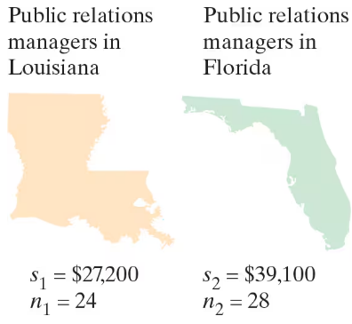 Annual Salaries An employment information service claims that the standard deviation of the annual salaries for public relations managers is less in Louisiana than in Florida. You select a sample of public relations managers from each state. The results of each survey are shown in the figure. At α=0.05, can you support the service’s claim? (Adapted from America’s Career InfoNet)
