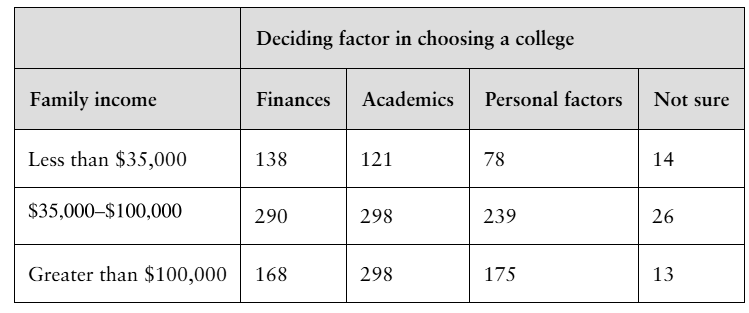 Choosing a College The contingency table shows the results of a survey asking 1858 parents and students of different incomes what their deciding factor was in choosing a college. At α=0.01, can you conclude that the deciding factor in choosing a college is related to the income of the family? (Adapted from Sallie Mae)