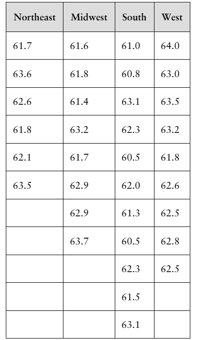 [APPLET] Well-Being Index The well-being index is a way to measure how people are faring physically, emotionally, socially, and professionally, as well as to rate the overall quality of their lives and their outlooks for the future. The table shows the well-being index scores for a sample of states from four regions of the United States. At α=0.10, can you reject the claim that the mean score is the same for all regions? (Adapted from Gallup and Healthways)