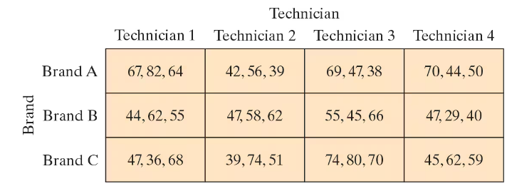 [APPLET] Laptop Repairs The manager of a computer repair service wants to determine whether there is a difference in the time it takes four technicians to repair different brands of laptops. The block design shows the times (in minutes) it took for each technician to repair three laptops of each brand.
