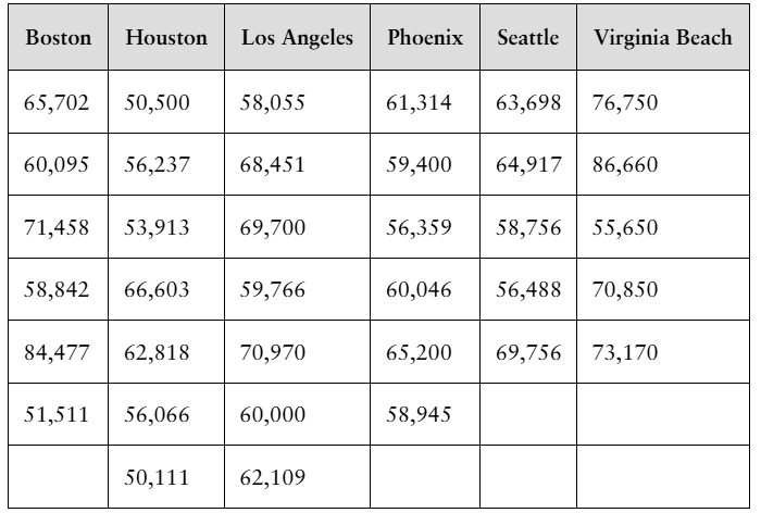 [APPLET] Statistician Salaries The table shows the salaries of a sample of entry level statisticians from six large metropolitan areas. At α=0.05, can you conclude that the mean salary is different in at least one of the areas? (Adapted from Salary.com)