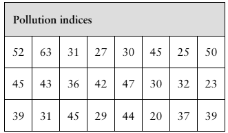 In Exercises 7 and 8, use the data set shown in the table at the left, which represents the pollution indices (a unitless measure of pollution ranging from 0 to 100) for 24 U.S. cities. (Adapted from Numbeo)