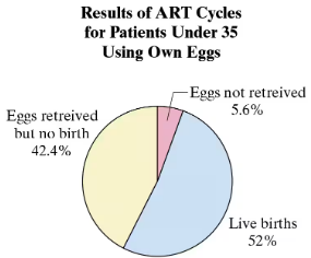 You are helping to prepare a CDC report on young ART patients and select at random 6 ART cycles of patients under 35 years of age for a special review. None of the cycles resulted in a live birth. Your manager feels it is impossible to select at random 10 ART cycles that do not result in a live birth. Use the pie chart at the right and your knowledge of statistics to determine whether your manager is correct.