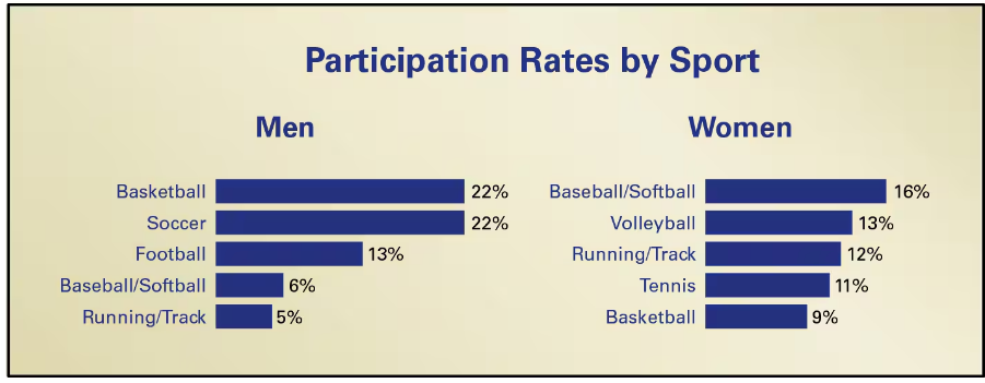 "Getting Physical The figure shows the results of a survey of U.S. adults ages 18 to 29 who were asked whether they participated in a sport. In the survey, 48% of the men and 23% of the women said they participate in sports. The most common sports are shown below. Use this information in Exercises 29 and 30.