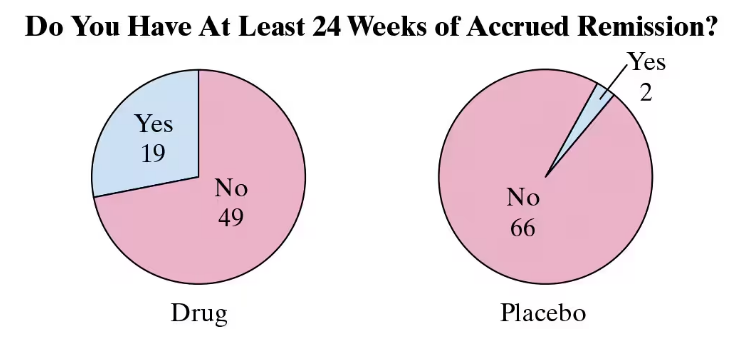 A medical research team conducted a study to test the effect of a drug used to treat a type of inflammation. In the study, 68 subjects took the drug and 68 subjects took a placebo. The results are shown below. At α=0.05, can you reject the claim that the proportion of subjects who had at least 24 weeks of accrued remission is the same for the two groups? (Source: The New England Journal of Medicine)
