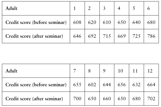 [APPLET] The table shows the credit scores for 12 randomly selected adults who are considered high-risk borrowers before and two years after they attend a personal finance seminar. At α=0.01, is there enough evidence to support the claim that the personal finance seminar helps adults increase their credit scores? Assume the populations are normally distributed.