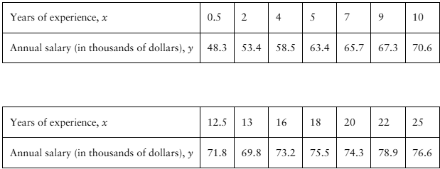 "[APPLET] Registered Nurse Salaries In Exercises 27–30, use the table, which shows the years of experience of 14 registered nurses and their annual salaries (in thousands of dollars). (Adapted from Payscale, Inc.)